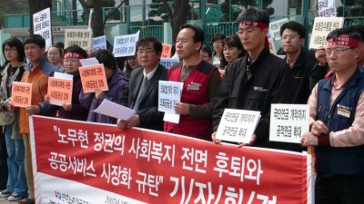간병인 공동대책위원회, 사회보험 징수통합 저지 공동투쟁본부, 공공서비스 시장화 저지 공동대책위원회(준), 민주노총 공공서비스노조 등 노동계는 이날 서울 광화문 정부종합청사 앞에서 기자회견을 갖고 "집권 말기를 향해 가고 있는 노무현 정권은 모든 국민이 마땅히 누려야 할 공공서비스를 시장화하면서 서민들의 삶을 더욱 피폐하게 하고 있다"고 비판했다.