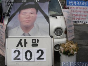 고 최동규 씨(사망 당시 38세)는 대우차 대구 남산지점에서 판매일을 해 오던 노동자로 출근 준비 중 지난해 9월 6일 '뇌지주막하출혈(의사소견)'으로 숨졌다. 노조는 최 씨의 사인과 관련해 "회사가 지난해 8월 경영 효율성을 이유로 승영직영부문을 소규모 법인으로 분리하는 과정에서 정규직 직원들은 강제로 '특수고용노동자'로 전환하려 시도했고 그 과정에서 고인이 심각한 스트레스를 받아 사망했다"고 주장하며 장례를 치르지 않고 있다. 반면 회사는 "직접적인 사인은 뇌출혈로 노조 측 주장을 논리적으로 인정할 수 없다"는 입장이다. 한편 법인 분리를 통한 정규직 직원의 강제 전적과 관련 지난 1월 인천지법은 부당하다며 무효판결을 내렸지만 회사는 전체 조합원에게 대기발령을 내리고 판매활동을 못하도록 막고 있다. 대우차판매노조의 한 조합원은 "회사가 영업활동을 강제로 못하게 해 이달 월급으로 20만 원밖에 못 받았다"고 털어놨다. |