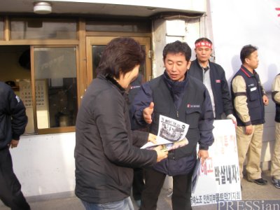 이날부터 6개월 간의 '현장대장정'을 시작하는 민주노총 이석행 위원장의 첫 출발지가 바로 인천 송내역 인력시장이었기 때문이다. 대장정의 첫날인 이날 새벽 이석행 위원장을 비롯해 민주노총 간부들 40여 명이 '총출동'한 탓에 인력시장은 난데없이 북적거렸다.