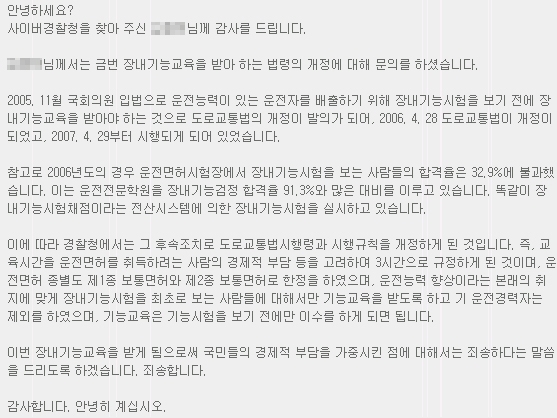 홈페이지에 올라온 '비용 부담' 지적에 대해 경찰청은 "응시자의 경제적 부담 등을 고려해 3시간으로 규정하게 된 것"이라고 답변했다. 다만 "이번 장내 기능교육을 받게 됨으로써 국민들의 경제적 부담을 가중시킨 점에 대해서는 죄송하다는 말씀을 드리도록 하겠습니다"라고 답했다.