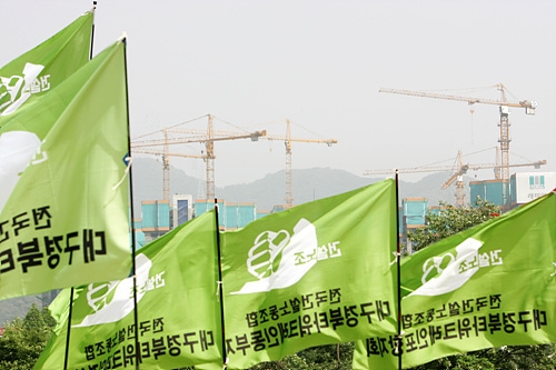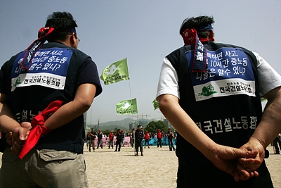 타워크레인 기사들은 열악한 근로조건에서 일하고 있는 노동자 가운데 하나다. 건설 노동자들이 제대로 된 화장실이나 식당도 없이 먼지 날리는 건설 현장의 위험에 노출돼 있다는 것은 이미 잘 알려진 바 있다. (☞관련기사 보기 : "탈당에, 대선에 여념없는 의원님들은 아시나요?", "건설노동자들은 새해가 두렵다") 이 때문에 건설 노동자들은 건설현장의 화장실 및 식당을 지어달라며 법개정 투쟁을 벌이기까지 했다. 남궁연 건설연맹 위원장도 이날 타워크레인 기사들의 총파업 출정식에서 "이 땅에 노동자는 참 많지만, '화장실 지어달라', '밥 먹게 해달라'고 싸우는 노동자는 건설노동자뿐"이라고 밝히기도 했다. 관련 법안이 지난 4월 국회를 통과하긴 했지만 기본적으로 건설 노동자들은 건설현장의 속성상 공사가 있을 때만 일을 하는 비정규직으로 고용불안에 시달릴 수밖에 없다. 타워크레인 기사들도 90% 이상이 현장별로 계약을 하는 비정규직이다. 노동 자체가 워낙 위험한 일이다보니 외환위기 이전까지는 상대적으로 고임금을 받아 왔던 이들이 IMF 외환위기 사태 이후 타워기사와 기존 건설회사 사이에 소위 '소사장제'로 불리는 용역업체들이 들어오기 시작하면서 임금의 상당 부분을 중간의 용역업체가 '착복'하고 있다는 것이 노조의 주장이다. 게다가 수 십 미터 고공의 한 평이 채 못 되는 조종실에서 하루 종일 땅만 바라보며 일을 하다보니 목과 허리 등에 무리가 오기 쉽상이어서 각종 척추질환, 신경성 질환 등의 직업병을 앓고 있다는 것. 또 아침에 한 번 올라가면 내려오기가 쉽지 않아 화장실 등도 심각한 문제다. 이날 출정식에서 만난 한 조합원은 "화장실에 가고 싶어질까봐 아무리 덥고 목이 말라도 물조차 잘 못 마신다"고 토로했다. 그나마 남성들은 여성보다는 나은 편이다. 한 여성 조합원은 "남자들은 음료수 병으로라도 해결이 가능하지만 여자들은 그러기도 쉽지 않다"고 말했다. 더욱이 정부가 타워크레인의 고정 방식 가운데 하나인 '벽체지지 방식'을 개별 기업에 강제할 수는 없다는 입장이어서 보다 불안정한 '와이어로프 지지방식'으로 타워크레인이 고정돼 있는 것도 문제다. (☞관련기사 보기 : 왜 타워크레인이 자꾸 전복되나 했더니…) '와이어로프 지지방식'은 '벽체지지 방식'보다 비용은 절감되지만 안전면에서는 더 불안정한 것이 사실이어서 타워크레인 기사들은 "매번 올라갈 때마다 무사히 살아서 내려올 수 있을까 불안해 하는" 나날을 보내고 있다. 노조는 "평균 13.3일에 한 번 꼴로 타워크레인 재해가 발생하고 있다"며 타워크레인 기사들의 위험도를 설명했다. |