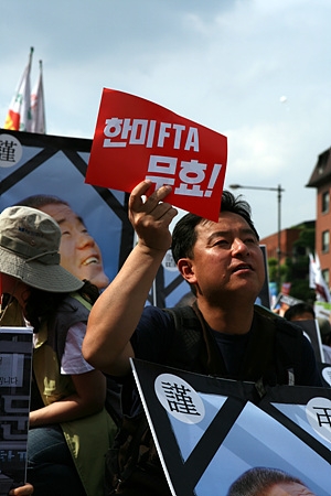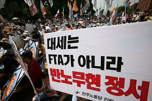 고(故) 허세욱 씨가 "한미 자유무역협정(FTA) 폐기"를 외치며 분신했던 날로부터 어느덧 2달이 지났다. 짧다면 짧고 길다면 긴 그 시간 동안 허 씨가 막고 싶어했던 한미 FTA 협상은 분신 바로 이튿날 끝내 타결됐고, 한글로 된 협정문도 최근 공개됐다. 공개된 협정문은 정부의 '장밋빛 선전'과 달리 온갖 독소조항들이 발견되고 있으며, 협상 시한 연기를 거듭하며 타결된 협상에 대해 미국은 노동과 환경 기준을 얘기하며 재협상을 언급하고 있다. 또 정부는 한미 FTA에 이어 한-EU FTA협상도 추진 중이다.