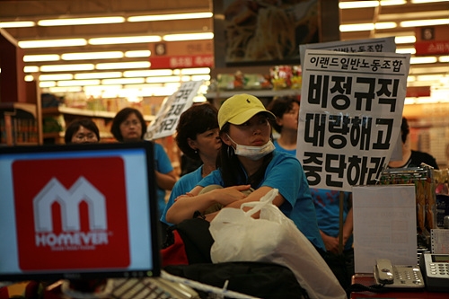 비정규법 시행을 하루 앞둔 30일 이랜드 그룹에 소유하고 있는 홈에버와 2001아울렛 비정규직 노동자 600여 명이 서울 마포구 상암동 홈에버 월드컵점을 점거하고 파업을 벌였다.