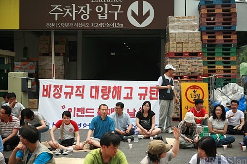 이날은 지난달 30일 홈에버, 2001아울렛 등에서 일하는 캐셔 등 여성 비정규직들이 홈에버 월드컵점을 점거한 지 9일째 되는 날이다. 이들은 이랜드 그룹이 지난 1일 시행된 비정규직법을 피해가기 위해 대거 계약해지 및 캐셔 업무 자체의 외주화를 진행하는 데 맞서 싸우고 있다. (☞ 홈에버 점거농성에 관한 더 많은 기사를 보시려면…)