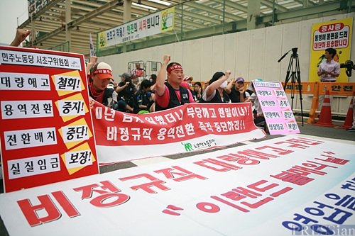 이들은 국민들을 향해 "우리 투쟁을 지지해 달라"며 "오늘 하루만큼은 인근의 홈에버, 뉴코아, 2001 아울렛을 이용하지 말아 달라"고 호소했다. 또 이들은 "너무나 심각하게 확산되고 심화된 비정규직 문제를 이제 국민 모두가 나서서 바꿔야 한다"고 강조했다.