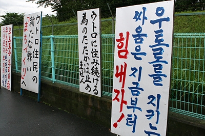 60여 년 동안 '싸우며' 지켜온 마을 우토로. 마을 사람의 대부분은 60세 이상의 재일동포 1,2세들이 대부분. 평생을 차별에 맞서, 가난에 맞서 싸우며 살아 온 이들은 한결같이 이렇게 말한다. 과거 '투쟁'의 시절 기운은 한 풀 죽었지만 목소리에 묻어나는 비장한 각오는 여전했다.