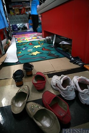 ▲ 상암동 홈에버 월드컵점은 이날로 이랜드일반노조의 점거농성 13일째를 맞았다. 열흘이 넘도록 이 곳에서 생활한 '아줌마'들이 뒤축이 접혀진 신발이 눈에 띈다. ⓒ프레시안