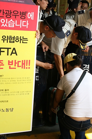 한편 '한미FTA 농축산비상대책위'(농대위) 등 미국산 쇠고기 수입 반대 단체들의 롯데마트 규탄 행동이 18일에도 이어졌다.