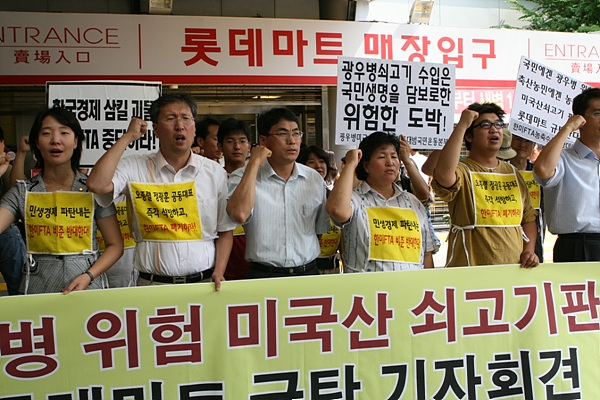농대위, '광우병위험 미국산쇠고기 국민감시단', '한미FTA저지 범국민운동본부' 회원 30여 명은 이날 오전 롯데마트 서울역점 앞에서 기자회견을 열고 "서울역지점 등 롯데마트 8개 지점에서 '판매중지' 약속을 받았으나, 16일부터 롯데마트는 53개 전 매장에서 미국산 쇠고기 판매를 감행했다"며 "광우병 위험에 대한 국민적 우려를 무시하고 우롱하는 처사에 대해 강력히 규탄한다"고 밝혔다.