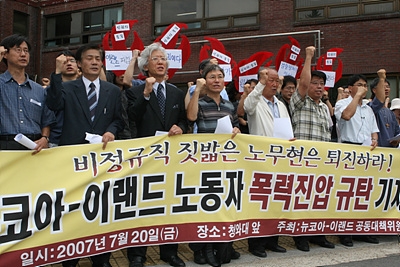 '뉴코아-이랜드 유통서비스 비정규노동자 노동기본권 보장을 위한 공동대책위원회'(이하 공대위)는 이날 정오 청와대 인근 청운동사무소 앞에서 긴급 기자회견을 열고 "민주정부이기를 포기한 노무현 정부의 폭력 진압을 강력 규탄하며, 이번 사태에 책임을 지고 노무현 대통령이 즉각 물러날 것을 요구한다"고 밝혔다.