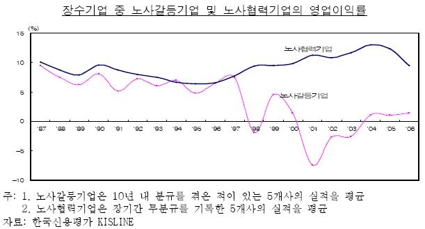 연구소는 25일 펴낸 '시이오 인포메이션'(CEO Information) 제614호에서 "1987년 이전에는 대규모 노사분규가 적어 노사관계가 수익성에 미치는 영향이 작았으나, 그 이후에는 노사관계와 수익성 간의 관계가 커졌다"며 "노사관계가 불안한 장수기업의 평균 영업이익률은 최근 20년간 3.5%인 반면, 노사관계가 안정된 기업들은 9.2%인 것으로 조사됐다"고 밝혔다.