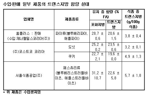식약청에 따르면 제너럴밀스코리아㈜에서 수입하고 홈플러스에서 판매하는 블루베리파이와 애플파이 등 파이류 제품의 트랜스지방 함량은 3.8g으로 나타났고, 코스트코 코리아㈜에서 판매하는 도넛은 3.2g, 쿠키는 4.9g인 것으로 나타났다. 특히 서울식품공업㈜에서 수입하는 페스츄리류에서는 트랜스지방이 무려 5.7g인 것으로 나타났다.