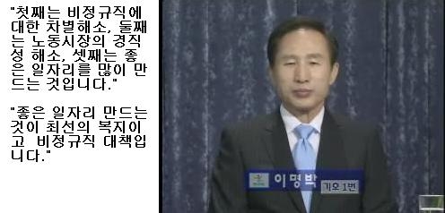 이명박: 최근 참으로 안타까운 일이 벌어지고 있습니다. 이랜드 경우처럼 800여만 명 비정규직 노동자들이 차별을 해소하기 위해 만든 법이 오히려 비정규직 대량 해고 사태를 불러왔습니다.