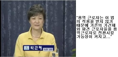 박근혜 후보께서는 계약직 근로자 2년 설정한 것을 부당하다는 취지로 말씀하셨는데, 이것도 조금 문제가 있습니다. 그리고 용역 근로자로 전환하는데 사유를 제한하자는 것 상당히 의미가 있습니다.