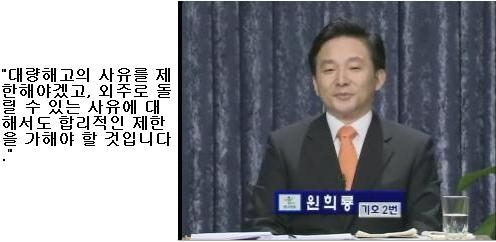 원희룡: 이번에 이랜드 사태에서 보듯이 지금 똑같은 비정규직 문제에 대해서도 회사마다 대처하는 방식이 다릅니다. 정규직과 비정규직이 서로 양보해서 회사에 협상을 통해서 협조를 통해서 원만하게 해결한 경우도 있구요, 이랜드처럼 2년 비정규직 2년 근속했을 경우에 정규직으로 고용해야 한다는 조항을 회피하기 위해 악용하는 경우도 있습니다.