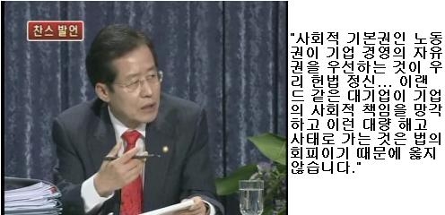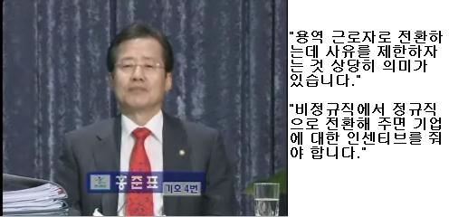 홍준표: 지금 비정규직 법안이 시행되면서 일어나고 있는 사태는 어떻게 보면 법의 회피입니다. 지금 이랜드 사태를 보면, 이랜드는 대기업입니다. 현재 삼성이나 우리은행, 엘지 등 대기업의 경우 비정규직을 전부 정규직으로 전환하고 있습니다. 법의 목적에 따라서.