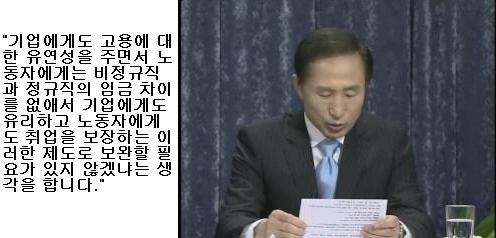 이명박: 지금 비정규직을 보호한다고 법을 만들었습니다. 어떻게 보면 법의 재난이라고 할 수도 있다고 봅니다. 제가 자주 출입하는 어느 음식점의 청소원 한 분은 지금 20년 째 비정규직 일을 하고 있으면서 불만 없이 하는데 가장 바라는 것은 임금을 정규직과 비슷하게 해주면 비정규직이라도 오래 일할 수 있었으면 좋겠다. 그런데 법을 바꿈으로써 오히려 쫓겨나게 됐고, 이제는 일자리를 잃게 됐다는 현실적인 문제를 이야기 하고 있습니다.