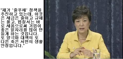 제가 '줄푸세' 정책을 추진하고 있는데, 이것은 세금은 줄이고 규제는 풀고, 법질서는 바로 세움으로써 기업이 좋은 일자리를 많이 만들게 하는 것입니다. 또 양극화 대책의 또 다른 축은 서민의 생활안정입니다. 저는 저소득층 자녀가 어릴 때부터 국가가 책임지는 드림 스타트 정책을 추진하고자 합니다.