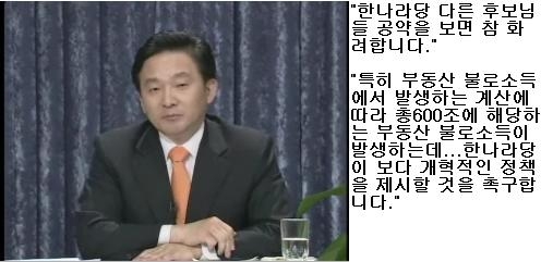 그 중에서 가장 노무현 정권에서 심화가 된 것이 부동산의 양극화입니다. 어떻게 보면 우리 사회의 양극화의 주범은 부동산입니다. 서민주거 안정책을 위해 반값 아파트를 제가 제안한 적이 있는데 그것은 아마 채택이 될 것 같고, 성인 1인 1주택제와 토지소유 상한제를 통해서 우리 사회 부동산에 몰려드는 약 500조가량의 돈을 산업자금으로 전부 돌려줘야 합니다. 그래야지 경제가 재도약할 수 있는 계기가 되기 때문에 저는 부동산 대책을 현재처럼 세금만으로만 하지 말고 이런 대책을 강구하자는 겁니다.