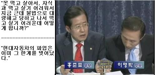 홍준표: (이명박 후보에게) 대한민국이 선진국으로 가기 위해서 아일랜드 처럼 무파업의 나라를 만드는 사회 대타협의 나라를 만들어야 한다고 보는데 거기에 대한 대책은 무엇인지 말씀해주십쇼.