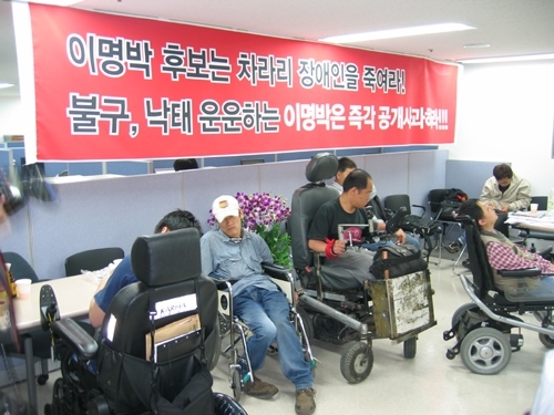 이들 단체는 "그 당시 장애민중의 정당한 권리투쟁에 가장 적대적이었고, 반인권적이었던 이명박 후보가 장애인 이동권 문제를 자신의 업적으로 선전하는 것은 또 다시 480만 장애인을 우습게 여기고 우롱하는 철면피한 작태"라고 주장했다.