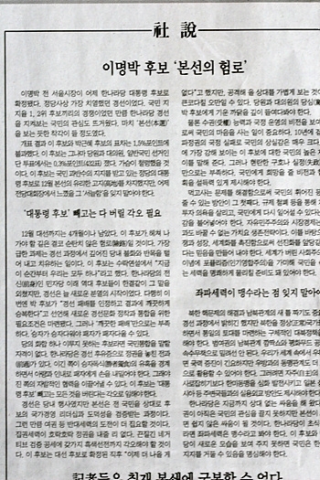 이 신문은 "경제를 다시 일으켜 선진국의 문턱을 넘고 분열된 사회를 더 높은 차원으로 통합해 대한민국이 다시 도약하기를 염원해온 많은 국민은 이제 이 후보를 현실의 대안으로 바라보게 됐다"면서 "이 국민적 염원에 부응할 수 있느냐 없느냐가 앞으로 이 후보와 한나라당의 운명을 결정짓게 될 것"이라고 밝혔다.