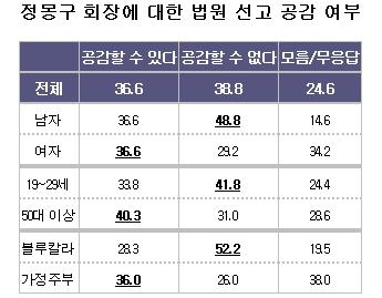 정 회장에게 선고된 8400억 원의 사회공헌을 조건에 대해 '공감할 수 없다'(38.8%)는 견해와 '공감할 수 있다'(36.9%)는 견해가 엇비슷하게 나타났다. 경제개혁연대에 따르면 여자, 50대 이상, 가정주부 층에서 공감한다는 의견이 높았던 것으로 알려졌다.