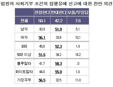또 기업인 범죄에 대해 사회공헌 등을 조건으로 집행유예를 선고하는 것에 대해서도 '찬성한다'는 견해(50.1%)가 '반대한다'는 견해(42.2%)보다 높게 나타나기도 했다.