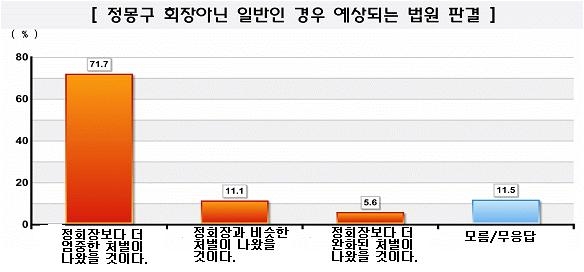 여론조사 결과에 따르면 조사대상자의 71.7%는 '피고인이 일반이었다면 정몽구 회장보다 더 엄중한 처벌이 나왔을 것'이라고 응답했다.