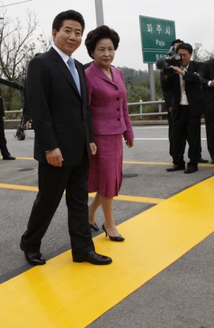 노 대통령은 이날 행사를 위해 특별히 표시된 노란 색의 군사분계선을 넘으며 "눈에 보이는 것은 아무 것도 없는데 여기 있는 이 선이 지난 반세기 동안 우리 민족을 갈라 놓고 있던 장벽"이라며 "내가 이번에 대통령으로 금단의 선을 넘어간다. 내가 다녀오면 더 많은 사람들이 다녀오게 될 것이고 마침내 이 금단의 선도 점차 지워질 것"이라고 말했다.