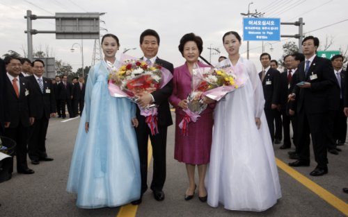 이 꽃다발을 건네받은 노 대통령은 권 여사에게 "가만히 있어봐. 꽃다발 주신 분들과 사진 한 번 찍자"고 즉석에서 제안해 두 명의 북측 여성들과 노 대통령 내외는 기념사진을 촬영했다.