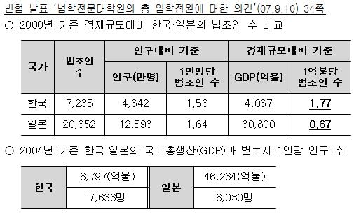 변협에서 제출한 의견에서 따르면 일본의 법조인(변호사, 판사, 검사)은 2만652명으로 전체 인구가 1억2593만 명임을 감안하면 1만 명당 법조인이 1.64명이다. 그런데 우리나라는 법조인 수가 7235명으로 인구 규모(4652만 명)를 감안하면 1만 명당 법조인은 1.56명으로 일본과 비슷하다는 설명이다.