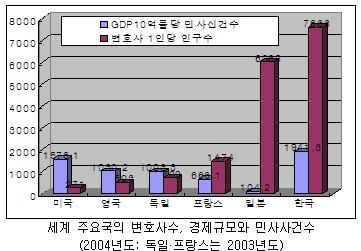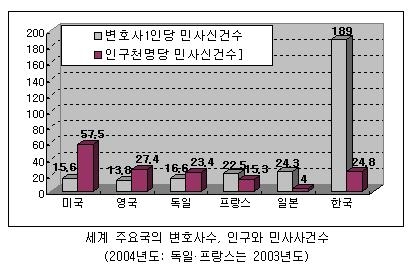 참여연대 사법감시센터 소장인 한상희 교수(건국대 법학)가 조사한 바에 따르면 우리나라는 변호사 1명당 민사사건이 189건 발생하고 있다. 반면 미국은 변호사 1인당 민사사건 발생건수가 15.6건이고, 영국은 13.8건, 독일은 16.5건, 프랑스는 22.5건으로 서구 국가들에 비해 변호사 1인당 사건 수가 월등히 많고, 일본도 24.3건으로 우리나라는 일본에 비해서도 7.7배에 달한다는 분석이다.
