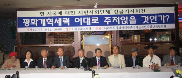 홍근수 목사, 함세웅 신부, 진관 스님, 이장희 한국외국어대 부총장 등이 주축이 돼 결성된 '나라의 희망과 미래를 준비하는 시민사회단체협의회'는 12일 서울 정동 세실 레스토랑에서 "평화개혁세력, 이대로 주저앉을 것인가?"라는 제목으로 긴급 기자회견을 열었다.