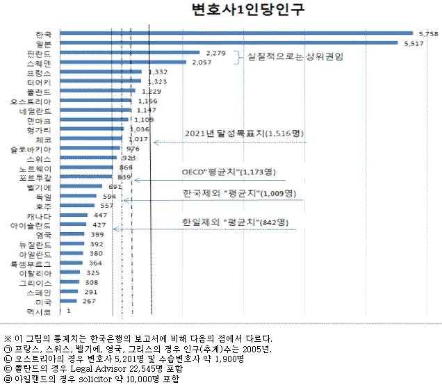 한 교수가 분석한 바에 따르면 첫째, 교육부가 '적정 변호사 수'의 목표치로 잡은 OECD 국가 법조인 1인당 변호사 수 기준이 틀렸다는 주장이다. 교육부가 내놓은 OECD의 변호사 1인당 인구수는 1482명. 변호사 자격증이 별도로 없는 멕시코를 제외한 총 29개국의 평균이다. 그런데 문제는 우리나라의 변호사 1인당 인구수가 OECD에서 거의 최하위권으로 우리나라가 OECD 평균을 깎아먹고 있다는 것이다.