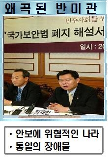 사진만 봐서는 최 의원이 왜곡된 반미관의 대표적 인물인 셈이다. 최 의원 옆에는 이석태 전 민변 회장의 모습도 보인다. 사진 아래에는 '안보에 위협적인 나라', '통일의 장애물'이라는 표현도 적혀 있다.