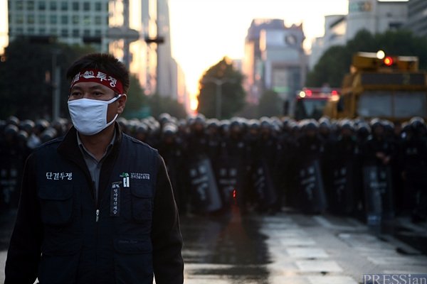 민주노총이 주최한 '정해진 열사 정신 계승 노동자대회'가 열린 6일 오후, 한국전력공사 본사가 있는 서울 강남구 삼성동의 화려한 빌딩 숲 사이. 지는 해와 화려한 강남의 중심부에 어울리지 않게 들어찬 전경들을 뒤로 하고 홀로 서 있는 한 건설 노동자가 쓸쓸해 보인다.