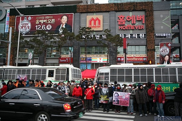 이날 새로 개장한 서울 구로구 홈에버 신도림역점 때문이었다. 파업 6개월째에 접어든 이랜드일반노조와 뉴코아노조 조합원 등 500여 명이 "홈에버가 장기화되는 파업사태 해결 없이 신규 점포를 오픈하려고 한다"며 '오픈 저지 투쟁'을 벌이고 있었다.