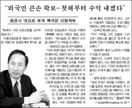<중앙일보>는 2000년 10월 14일 이 후보의 말을 인용해 "LKe 뱅크가 이미 설립돼 있으며 그 아래 종합자산관리 전문회사인 BBK란 자회사도 영업 중에 있다. 물론 이들 회사에서 이(명박) 전 의원은 대주주로서 경영에도 참여하고 있다"고 보도했다. 이틀 뒤인 16일에도 <중앙>은 "이미 새로운 금융상품 소프트웨어를 개발하는 LKe뱅크와 자산관리 회사인 BBK를 창업한 바 있다"는 이 후보의 말을 실었다.