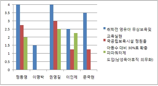 특히 이명박 후보의 경우 보육에 대한 국가 책임을 강조하고 있으나 무상보육이 아닌 '보육비 지원'을 주된 내용으로 하고 있어 정책 홍보 내용과 실제 공약 내용에 차이를 보이기도 했다고 KYC는 평가하기도 했다.