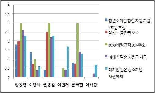 반면 1점 미만의 낮은 점수를 받은 이인제, 이명박, 이회창 후보는 "경제성장을 통한 일자리 창출" 이외에는 눈에 들어오는 구체적인 공약이 부족하다는 평가를 받았다.