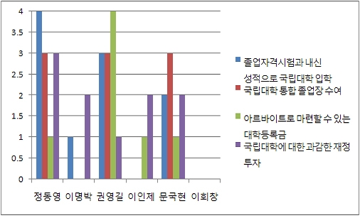 각 후보별로 살펴보면 정동영 후보는 입시제도의 개혁과 청년실업 해소 분야에서 다른 후보들에 비해 높은 점수를 받았다.