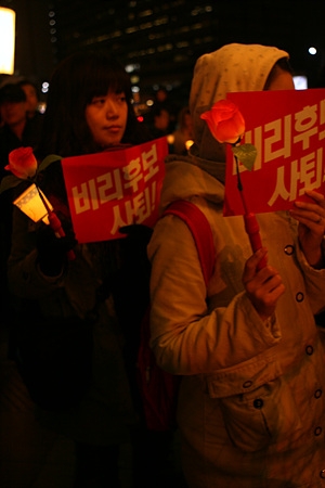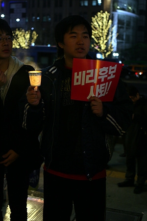 또 다른 참가자는 "이명박 후보는 도덕성 외에도 서민을 외면하는 정책을 내세우고 있다"며 "이 후보가 당선이 되면 사회경제적 양극화가 더욱 심화될 것"이라고 목청을 높였다.