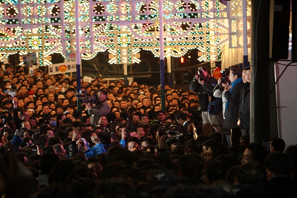 한편 같은 시각 대로 건너 동아일보 빌딩 앞 청계 광장에서는 이명박 후보의 지지자 1000여 명이 운집한 가운데 이 후보의 유세가 펼쳐지는 등 광화문 일대는 '親 이명박'과 '反 이명박'의 함성 소리가 뒤엉켜 막판 대선 열기를 더했다.