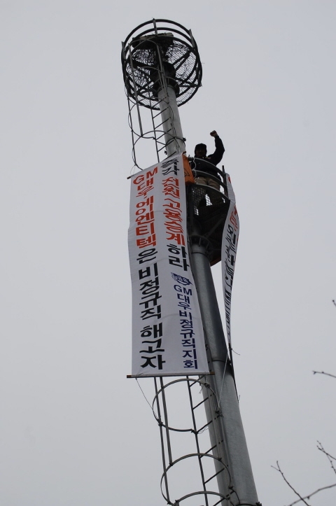 박 씨가 CCTV 관제탑에 올라간 것은 지난해 12월 27일. 노동조합 설립 이후 줄줄이 해고된 35명의 복직을 위해서다. GM대우에는 지난해 9월 처음으로 하청업체 비정규직이 노동조합을 만들었지만 노조 설립 후 업체가 아예 폐업을 하면서 조합원 대다수가 길거리로 나앉았다(☞ 관련 기사 : 새해에 들떠있는 지금, 당신의 이웃은…).