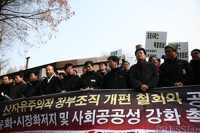 공무원노조를 비롯해 전교조, 공공운수연맹, 언론노조, 사무금융연맹, 보건의료노조 등 민주노총 산하 산별노조 및 연맹은 이날 서울 삼청동 인수위 앞에서 기자회견을 열고 "당선인의 '작은 정부론'은 정부의 공공적 기능을 시장에 맡겨서 사회공공성을 약화, 훼손시키겠다는 것에 지나지 않는다"고 비판했다.