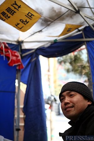 추운 날씨에 오래 거리 농성을 하다 보니 코스콤 비정규직의 복장은 거의 똑같다. 검은 모자에 두툼한 점퍼, 여러 겹 껴입었을 것 같은 넉넉한 트레이닝복 바지까지. 아내와 여섯 살 딸아이를 둔 서른다섯 살 가장이 어쩌다 여기까지 오게 됐을까.