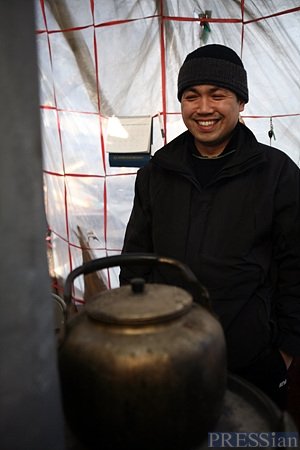 그는 웃으면서 뜨거운 물을 부은 인스턴트 커피를 포장 비닐로 휘휘 저어 건넸다.