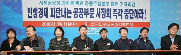 민주노총은 11일 기자회견을 통해 "7개 산별노조가 공동투쟁본부를 구성하고 상반기를 사회공공성 강화를 위한 분기점으로 만들겠다"고 밝혔다. 공공부문 시장화와 사유화에 맞서 공동투쟁을 벌이기로 한 산별노조는 공공운수연맹, 전국교직원노동조합, 보건의료노조, 사무금융노조, 언론노조, 전국공무원노조, 대학노조다.