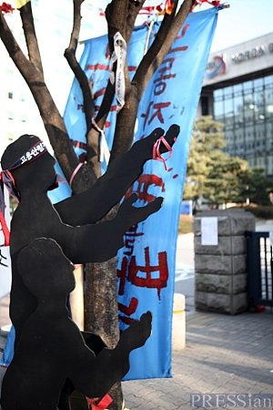 이들이 증권선물거래소를 '타깃'으로 정한 것은 코스콤비정규직지부의 파업 180일이 넘도록 전혀 움직이지 않고 있는 코스콤 때문이다. 오는 20일 주주총회에서 새로 선임되는 증권선물거래소 이사장이 나서서 자회사인 코스콤을 압박해야 한다는 것.